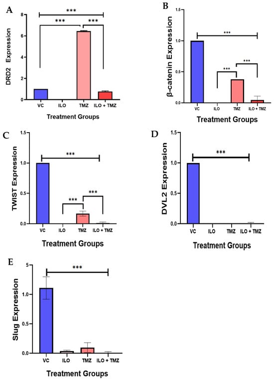 The effect of ILO, TMZ, and their combination on the mRNA expression of the Wnt/β-catenin pathway-related genes (β-catenin, Dvl2, Twist, and Slug) in U-87 MG cells after 48 h of treatment. (A) ILO and combination treatment significantly reduced the expression of DRD2 as compared to control, while TMZ upregulated the expression significantly. (B) β-catenin expression was significantly reduced in all treatment groups in comparison to VC. However, TMZ increased the expression in comparison to other groups. (C) Twist was significantly reduced in all treatment groups in comparison to VC. However, the TMZ-treated cells have a higher expression in comparison to other groups. (D) Dvl2 was also significantly reduced in all the treatment groups as compared to the VC group. (E) Slug expression was reduced in all the treatment groups compared to the VC. The expression of each gene is normalized with β-actin expression. Each bar represents mean ± S.E.M of three independent experiments. Significant differences between VC and other treated groups were indicated by *** p < 0.001.