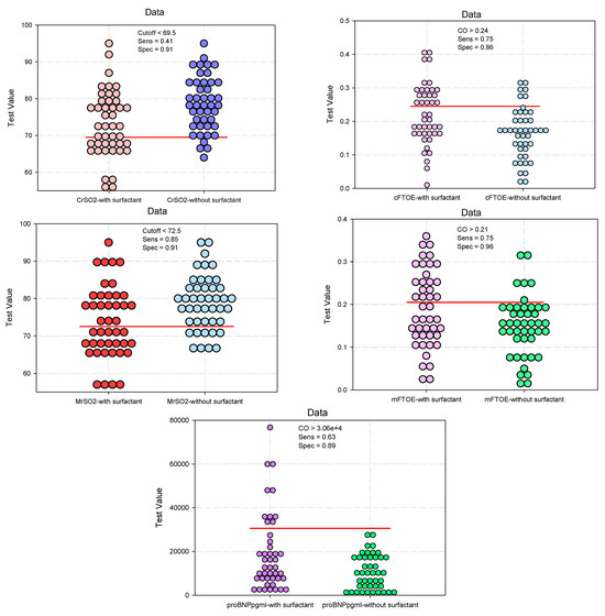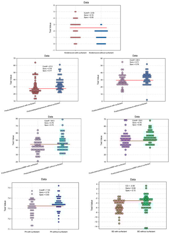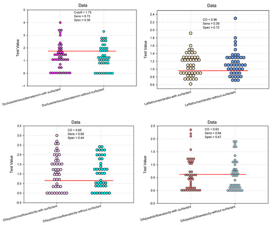 The study results showed that administering surfactant had a significant predictive power on the clinical parameters of assessing the ductus arteriosus, as presented in Table 3. The cutoff values of the clinical parameters for the evaluation of the ductus arteriosus at 24 h after surfactant administration, as shown in Figure 2, indicate the predicted reference thresholds (cutoff), which can classify newborns according to surfactant administration. These values can be used as references in the clinical evaluation of the ductus arteriosus.