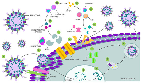 Mechanism of SARS-CoV-2 infection. (1) The interaction of the receptor-binding domain (RBD) of the S protein with the angiotensin-converting enzyme 2 (ACE2), as well as the action of proteases like trans-membrane serine protease 2 (TMPRSS2), which, together, allow (2) the entry of the virus into the type II alveolar cell. Subsequently, (3) the viral RNA enters the cell nucleus for (4) replication and (5) protein biosynthesis, (6) both products are included in new viral particles that will be released. This results in (7) the activation of inflammasome 3 (NLRP3), (8) undergoing cell apoptosis and pyroptosis through gasdermin-D pores, and (9) cytosolic content release, including some damage-associated molecular patterns (DAMPs) that are detected by alveolar macrophages, triggering (10) an inflammatory response mediated by pro-inflammatory cytokines that (11) attract monocytes and T lymphocytes. The latter (12) releases granulocyte–macrophage colony-stimulating factor (GM-CSF), which (13) activates CD14+ and CD16+, resulting in a pro-inflammatory feedback loop that ultimately (14) leads to severe lung damage through the direct action of the virus, proteases, and reactive oxygen species.