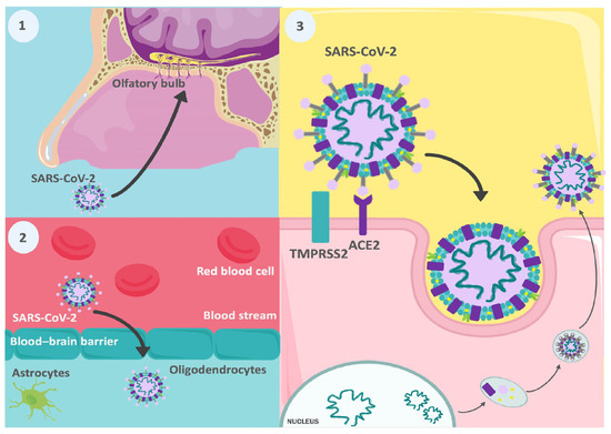 This hypothesis is supported by a study conducted by Meinhardt et al., in which autopsies of 33 patients with COVID-19 were performed. Using real-time quantitative reverse transcription polymerase chain reaction (RT-qPCR), abundant SARS-CoV-2 copies were found in the olfactory mucosa, directly beneath the ethmoid’s cribriform plate, in 20 out of 30 individuals; viral RNA copies were also found, in lower quantities, in the olfactory bulb in 3 out of 31 people. Similarly, the cornea, conjunctiva, and oral mucosa showed viral RNA in smaller amounts, positioning the oral and ophthalmic routes as other potential entry points to the CNS [51].