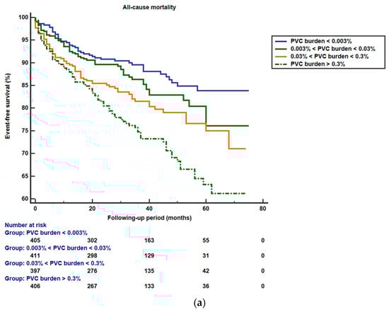 Atrial fibrillation (AF) is the prevailing cardiac arrhythmia worldwide, affecting around 2% to 3% of the population. Moreover, the incidence of AF is considerably greater in those with heart conditions such as myocardial infarction or heart failure []. The predictive significance of PVCs in AF patients is still uncertain. Although the adverse effects of PVCs on cardiovascular function in patients with sinus rhythm are extensively researched, the rhythm irregularity of AF makes it difficult to accurately measure and understand the influence of PVCs on this condition. A recent study has demonstrated a correlation between AF and increased mortality in patients with existing ventricular tachyarrhythmias, specifically ventricular tachycardia (VT) and ventricular fibrillation (VF) []. Nevertheless, the precise correlation between PVCs burden and AF has yet to be clearly established in the current field of research. This study aims to bridge this gap by evaluating the influence of PVC burden in patients with persistent AF, based on 24 h electrocardiography (ECG) monitoring, on the cardiovascular and all-cause mortality during a long-term clinical follow-up.