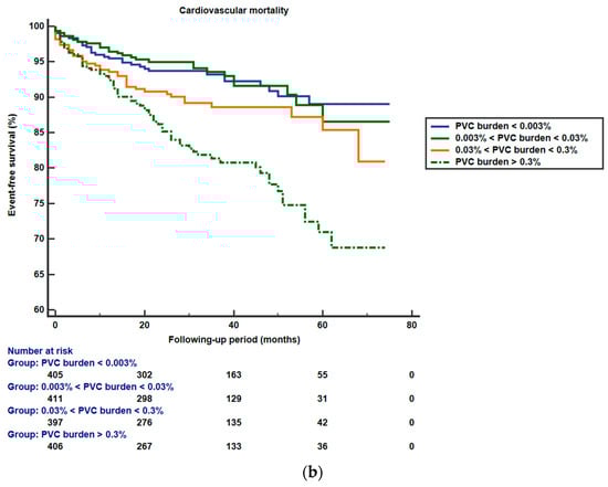 In terms of the PVC measurements, the overall 24 h PVC burden and the occurrence of consecutive PVC episodes (including any PVC couplet, triplet, or ventricular tachycardia episode) were found to correspond to both all-cause and cardiovascular mortality, regardless of adjusting for baseline characteristics (as shown in Table 3).