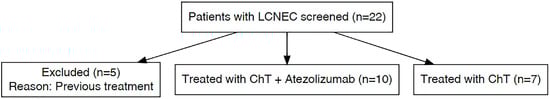 Between November 2019 and August 2022, 22 patients were prospectively screened for enrollment in the study. Of the 22 patients, 5 were excluded as ineligible because they had previously received chemotherapy and radiotherapy since they were initially diagnosed with limited-stage disease. The remaining 17 patients met all the eligibility criteria and were included in the study. The biopsies of the enrolled patients were reviewed by a second pathologist. In two patients, a third consultation was required to confirm the diagnosis of LCNEC. Of these patients, 10 were recruited to the experimental arm and treated with carboplatin, etoposide, and atezolizumab, while 7 patients were treated with carboplatin and etoposide and served as the control arm (Figure 1). The median follow-up duration was 23.3 months.