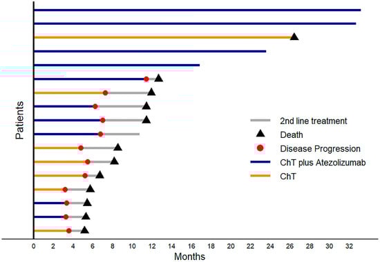 The objective response rate (ORR) was 50% for the experimental group (chemotherapy plus atezolizumab; ChT plus atezolizumab) and 42.9% for the control group (chemotherapy alone; ChT). At the conclusion of the study follow-up period, 40% of the individuals in the experimental group did not experience disease progression, in contrast to the control group, where none of the patients survived (Figure 2).