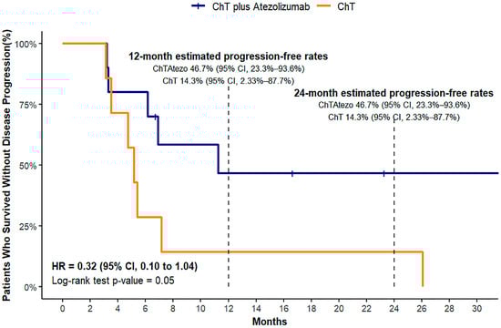 We observed that the median progression-free survival (PFS) was not attained within the median follow-up period of 23.3 months in the ChT plus atezolizumab group, indicating prolonged periods without disease progression in a substantial proportion of patients. In contrast, the median PFS was 5.2 months (95% CI, 3.2–26.4) in the ChT group. In light of these findings, we present survival probabilities at fixed 12- and 24-month intervals to facilitate a more straightforward interpretation (Figure 3). These time points yielded crucial insights, with a 12-month estimated progression-free rate of 46.7% for the ChT plus atezolizumab group (95% CI, 23.3–93.6%) compared to 14.3% for the ChT group (95% CI, 2.33–87.7%). The 24-month rates mirrored these findings, underscoring the persistent trend. A log-rank test demonstrated a trend towards improved outcomes in the ChT plus atezolizumab group (p = 0.05). Additionally, the adjusted hazard ratio for PFS was 0.32 (95% CI, 0.10 to 1.04), implying a potential reduction in the risk of progression or death.