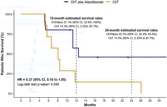 The median overall survival (OS) was not reached in the ChT plus atezolizumab group during the median follow-up of 23.3 months. In contrast, the median OS for the ChT group was 8.2 months (95% CI, 5.2–26.4). Given these findings, we presented survival data at the 12- and 24-month time points (Figure 4). This approach revealed a 12-month estimated survival rate of 57.1% for the ChT plus atezolizumab group (95% CI, 32.6–100%) versus 14.3% for the ChT group (95% CI, 2.33–87.7%). The 24-month survival rate for the ChT plus atezolizumab group was 45.7% (95% CI, 22.4–93.2%), demonstrating the sustained effectiveness of this treatment regimen. In contrast, the survival rate for the ChT group was maintained at 14.3% (95% CI, 2.33–87.7%), highlighting significant disparities in long-term outcomes between the treatment groups. The log-rank test indicated a significant difference in survival with a p-value of 0.04, and the hazard ratio for OS favored the ChT plus atezolizumab group (HR = 0.37, 95% CI, 0.10–1.05), suggesting a possible survival advantage.
