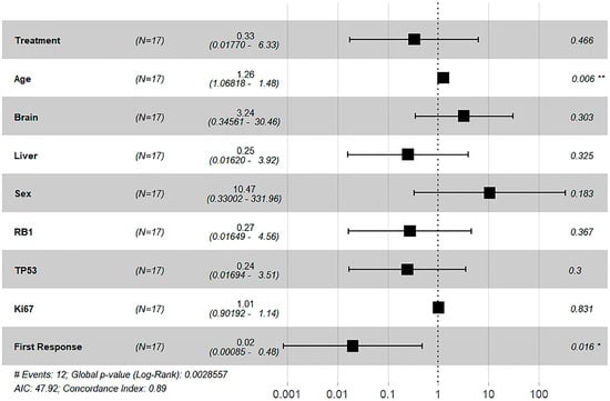 Figure 5. Cox regression survival analysis, including the treatment, age, sex, de novo brain and liver metastasis, ki67, TP53, RB1 status, and first response. * p < 0.05; ** p < 0.01.