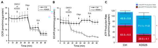 Real-time ATP rate assay after addition of 10 μM KD025 in HTM cells. OCR values (A) and ECAR values (B) in planar HTM cells. Solid lines and black circles indicate the control group that received DMSO from the injection port A (n = 6) and dotted lines and open circles indicate the group that received KD025 (final concentration: 10 μM) from the injection port A (n = 6). Calculated mitochondrial ATP production rate (blue color) and glycolytic ATP production rate (red color) using online Seahorse Analytics (https://seahorseanalytics.agilent.com) are indicated (C). Data are presented as means ± the standard error of the mean (SEM). * p < 0.05 (Student’s t-test).