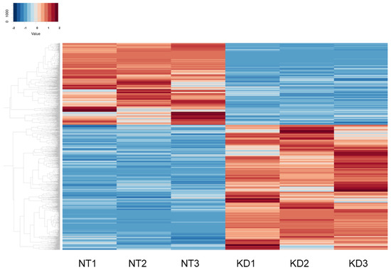 Heatmaps for DEGs for HTM cells not treated with KD025 (NT 1–3) and HTM cells treated with KD025 (KD 1–3). Differentially expressed genes (DEGs) in HTM cells not treated with KD025 (NT1~3) and HTM cells treated with KD025 (KD1~3) are shown by a hierarchical clustering heatmap. Colored points represent differentially expressed genes (cutoff FDR < 0.05) and/or the magnitude of change ≥2 that are either overexpressed (red) or underexpressed (blue) in KD HTM cells compared with their expression levels in NT HTM cells.