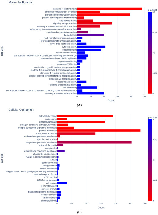 Results in GO enrichment analysis. Bar charts showing the GO terms for cellular component (A) and molecular function (B). Bar color represent p adjusted values (<0.2) and x-axis represents numbers of DEGs.