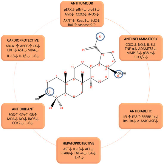 Over the past few years, numerous BE derivatives, such as betulinic acid (BA), betulonic acid (BoA), and 23-hydroxybetulinic acid (HBA), have been synthesized, which characterized targeted, specific action and better bioavailability in comparison to the original compound [6,27].