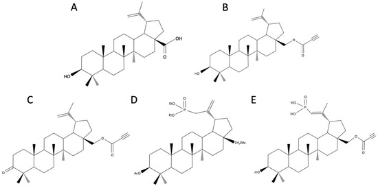 Chemical structure of betulinic acid (A), 28-O-propynoylbetulin (B), 28-O-propynoylbetulone (C), 3β,28-diacetoxy-30-diethoxyphosphoryl-lup-20(29)-ene (D), and 29-diethoxyphosphoryl-28-propynoyloxy-lup-20E(29)-en-3-ol (E).