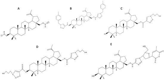 Chemical structure of 3,28-O,O′-di(propynoyl)betulin (A), 3,28-O,O′-di[1-(4-fluorobenzyl-1H-1,2,3-triazol-4-yl) carbonyl]betulin (B), 28-O-[1-(3-hydroxypropyl)-1H-1,2,3-triazol-4-yl]carbonylbetulin (C), 3,28-O,O′-di[1-(3-hydroxypropyl-1H-1,2,3-triazol-4-yl)carbonyl]betulin (D), and 28-O-[1-(3′-deoxythymidine-5′-yl)-1H-1,2,3-triazol-4-yl]carbonylbetulin (E).