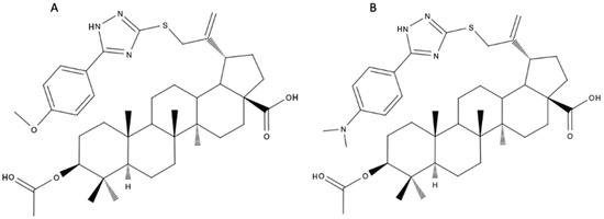 Chemical structure of 3β-O-acetyl-30-[5-(4-methoxyphenyl)-1H-1,2,4-triazol-3-yl)-sulfanyl]-betulinic acid (A) and 3β-O-acetyl-30-{5-[4-(dimethylamino)phenyl]-1H-1,2,4-triazol-3-yl)sulfanyl}-betulinic acid (B).
