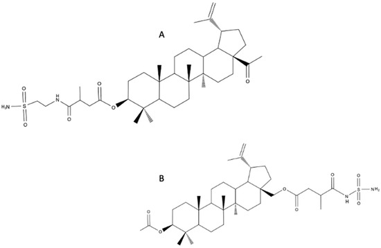 Betulin sulfonamides are considered agents of potential use in the treatment of breast cancer. Sulfonamides are known as carbonic anhydrase inhibitors. Excessive expression of carbonic anhydrase correlates with a poor prognosis in some types of cancer [57]. Two compounds: (1R)-3a-(acetoxymethyl)-5a,5b,8,8,11a-pentamethyl-1-(prop-1-en-2-yl)icosahydro-1H-cyclopenta[a]chrysen-9-yl 3-methyl-4-oxo-4-(2-sulfamoylethylamino)butanoate (Figure 10A) and (((1R)-9-acetoxy-5a,5b,8,8,11a-pentamethyl-1-(prop-1-en-2-yl)icosahydro-1H-cyclopenta[a]chrysen-3a-yl)methyl 3-methyl-4-oxo-4-(2-sulfamoylethylamino)butanoate) (Figure 10B) were investigated. The in vitro activity of betulin sulfonamides against breast cancer cell lines (HS578T, MDA-MB-231, BT-20, MCF-7, T47D, SKBR3) was higher than the activity of BA. Especially promising seems to be the results against the triple-negative breast cancer line [58].