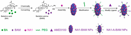 One of the first attempts to create NPs with a BA derivative was made by Das et al. A derivative of BA (dBA) obtained from Phytolacca americana (1-isopropenyl-5a,5b,8,8,11a-pentamethyl-1,2,3,4,5,5a,6,7,7a,8,11,11a,11b, 12,13,13b-octadecahydro cyclopenta[a]chrysene-3a-carboxylic acid) (Figure 12A) was encapsulated into poly(lactide-co-glycolide) (PLGA) by the solvent displacement technique [67]. The mean diameter of the obtained NPs was around 110 nm [67]. The study demonstrated that both dBA and dBA loaded into NPs decreased the viability of lung cancer cells (A549) in a dose-dependent manner. The results showed that dBA and dBA loaded in NPs, directly targeted the mitochondrial oxidative phosphorylation system. However, a stronger effect was observed for dBA loaded in NPs, indicating that they may be a better candidate for the development of an anticancer drug for use against lung adenocarcinomas. The study also helped to understand the mechanism of action of dBA, its influence on mitochondria, and the process of directing cells to the apoptotic pathway [67]. The influence of the tested molecules on the increase in the intracellular concentration of Ca2+ released from the endoplasmic reticulum (ER), which is one of the apoptotic factors, has been shown. Furthermore, an increase in ROSs and a decrease in the rate of oxidative phosphorylation have been observed, indicating the potential impact of these factors on mitochondria [67]. Moreover, an in vivo study was conducted to determine the potential of dBA-loaded NPs for absorption in various tissues. It has been shown that dBA loaded in NPs is distributed to tissues faster than dBA, and it can cross the blood–brain barrier (BBB) [68].