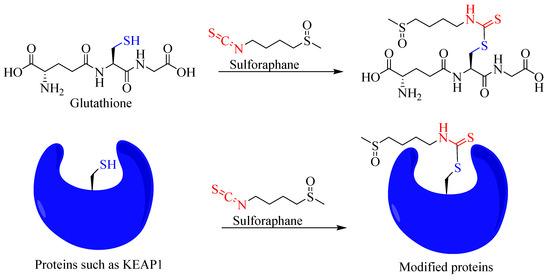 Overview of covalent interaction of sulforaphane with the sulfhydryl group of biomolecules.
