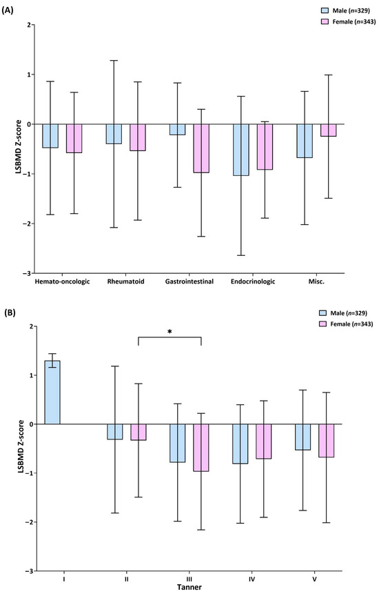 Bar graphs representing the male and female lumbar spine bone mineral density (LSBMD) Z-scores. (A) Bar graphs based on disease category (hemato-oncologic, rheumatoid, gastrointestinal, endocrinologic, and misc. (unclassified)). (B) Bar graphs based on Tanner stage. Whiskers indicate standard deviations. The asterisk (*) indicates when it is significantly differed.