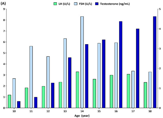 - Albin, A.K.; Norjavaara, E. Pubertal growth and serum testosterone and estradiol levels in boys. Horm. Res. Paediatr. 2013, 80, 100–110. [Google Scholar] [CrossRef]