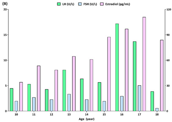 The mean sex hormone Z-scores according to the disease category are presented in Table 1. The mean male testosterone Z-scores in all disease categories were positive, although the values were close to zero. Contrastingly, female estradiol levels were near to −1.0 in all disease categories. The LH, FSH, and testosterone concentrations in males across different age groups from 10 to 18 years of age are shown in Figure 2A. In the male participants, the highest levels of LH and FSH were 3.29 ± 4.28 and 8.33 ± 11.15 U/L, respectively, both at the age of 14 years. The mean differences in the LH and FSH levels between 10 and 14 years of age were −2.11 U/L (p < 0.001) and −5.64 U/L (p = 0.006), respectively. Testosterone levels gradually increased with age, showing the highest concentration at 18 years of age (4.62 ± 1.18 ng/mL). The mean difference in testosterone level was greatest at −4.21 ng/mL between the ages of 9 and 16 years (p = 0.012). The LH, FSH and estradiol concentrations in females across different age groups from 10 to 18 years of age are shown in Figure 2B. In the female participants, the highest LH and FSH levels were 17.24 ± 34.98 and 30.31 ± 39.89 U/L, which were observed at the ages of 16 and 17 years, respectively. The mean difference in the LH level was greatest at −12.96 U/L between 12 and 16 years of age (p = 0.002). On the other hand, FSH levels did not show any significant difference among the age groups. Similar to testosterone, estradiol levels also gradually increased with age, showing the highest concentration at the age of 17 years (111.1 ± 118.6 pg/mL). The mean estradiol concentration at 18 years of age was 84 ± 87.3 pg/mL, which was based on an assessment of five participants. The mean difference in estradiol was greatest at −76.9 pg/mL between 10 and 17 years of age (p = 0.001).