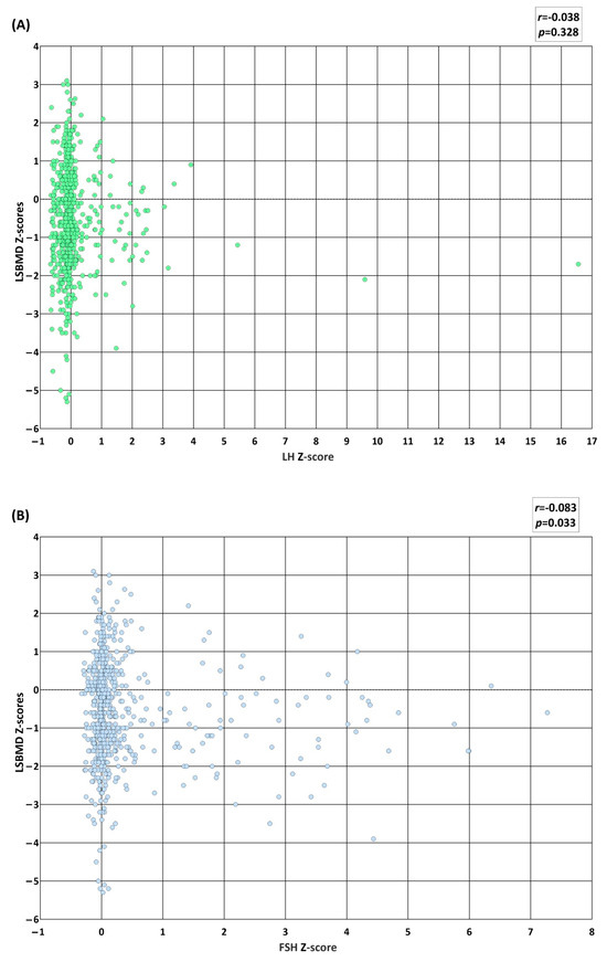 A total of 659 subjects with records of their Tanner stage at the time of their BMD examination were included in this analysis. The LSBMD Z-scores were linearly correlated with the Z-scores of testosterone (p = 0.012) and estradiol (p = 0.005), and inversely with FSH Z-scores (p = 0.033) (Figure 3). The value of the correlation coefficient was the highest between LSBMD and estradiol (r = 0.138), followed by that between LSBMD and testosterone (r = 0.126), and LSBMD and FSH (r = −0.083) (Figure 3B–D). There was no direct correlation between the LSBMD Z-scores and LH Z-scores (Figure 3A). A univariate regression analysis revealed that the male LSBMD Z-scores were positively associated with the Z-scores for sex- and Tanner-stage-matched testosterone (β = 0.9, 95% confidence interval (95% CI) = 0.4–1.39, and p < 0.001) and sex- and age-matched body mass index (BMI) (β = 0.34, 95% CI = 0.4–1.39, and p < 0.001), and negatively associated with age at diagnosis of underlying disease (β = −0.06, 95% CI = −0.09–−0.02, and p < 0.001) (Table 3). On the other hand, the female LSBMD Z-scores were positively associated with the Z-scores of sex- and Tanner-stage-matched estradiol (β = 0.15, 95% CI = 0.04–0.26, and p = 0.009) and sex- and age-matched BMI (β = 0.24, 95% CI = 0.16–0.32, and p < 0.001), and negatively associated with the sex- and Tanner-stage-matched FSH (β = −0.12, 95% CI = −0.22–−0.02, and p = 0.025). The sex- and Tanner-stage-matched LH Z-scores were linearly and inversely associated with the LSBMD Z-scores of male and female participants, respectively; however, these associations were not statistically significant. The sex- and Tanner-stage-matched Z-scores of testosterone (β = 1.27, 95% CI = 0.82–1.71, and p < 0.001) of the male participants remained positively related to the LSBMD Z-scores in the multivariate regression analysis. Contrarily, estradiol in female participants showed no correlation with the LSBMD Z-scores in the multivariate study. In the same analyses, the sex- and age-matched BMI Z-scores showed an independent linear association with the LSBMD Z-scores for both male (β = 0.36, 95% CI = 0.28–0.44, and p < 0.001) and female (β = 0.22, 95% CI = 0.13–0.29, and p < 0.001) participants. Regarding the multivariate regression analyses for each disease category (Table S1a–d), the LSBMD Z-scores were associated with the male testosterone Z-scores of hemato-oncologic diseases (p < 0.001), male LH Z-scores of rheumatoid diseases (p = 0.049), and female estradiol Z-scores of endocrinologic diseases (p = 0.006). The multivariate regression analysis conducted for height-adjusted LSBMD Z-scores showed a negative correlation with the LH Z-scores in males, while both sex hormone Z-scores did not achieve a statistical significance (Table S2).