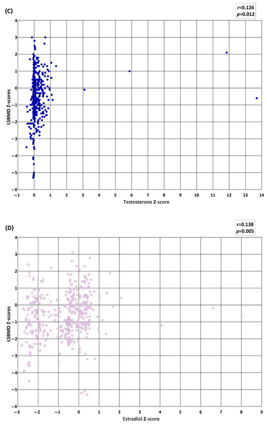 Scatter plots representing the relationship between sex- and age-matched lumbar spine bone mineral density (LSBMD) Z-scores and sex- and Tanner-matched gonadotropin or sex hormone Z-scores. LSBMD Z-scores (y-axis) are displayed against (A) luteinizing hormone (LH) Z-scores, (B) follicular-stimulating hormone (FSH) Z-scores, (C) male testosterone Z-scores, and (D) female estradiol Z-scores.