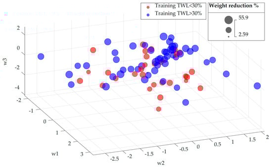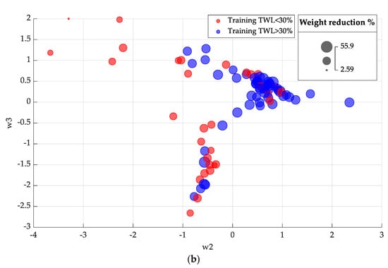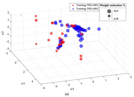 Representation of the training-set patients in the reduced coordinate space (w1, w2, w3) after optimization and weighting: (a) perspective view; (b) side view. Red bubbles correspond to patients with TWL < 30%, whereas blue bubbles represent patients with TWL ≥ 30%.