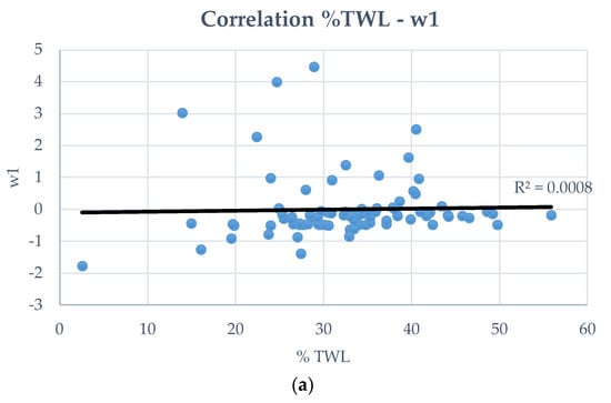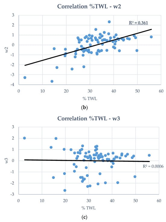 The representation of the patient values (w1, w2, w3) in the low-dimensional space versus the postoperative %TWL of each patient was also analyzed. The variable w2 was useful for binary classification. Furthermore, as mentioned above, the directions w1, w2, and w3 are uncorrelated and capture the main sources of variability in the data. Therefore, if w2 is at least partially correlated with %TWL, w1 and w3 will capture some other variability of data from unknown sources not correlated with %TWL.