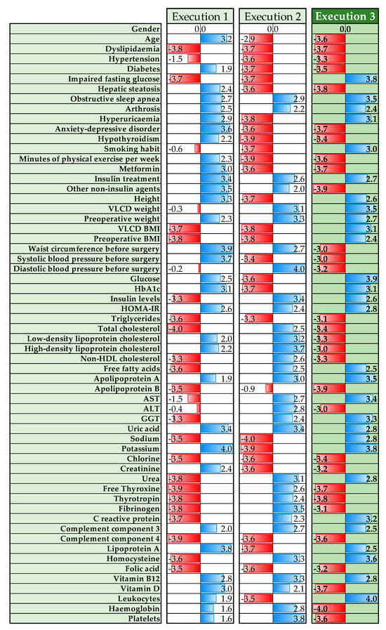 Some of the α parameters yielded high values in each of the three executed runs. The variables associated with high α values in the three runs were as follows: (1) obstructive sleep apnea (OSA), (2) osteoarthritis, (3) insulin treatment, (4) preoperative weight (after VLCD), (5) insulin resistance index (HOMA-IR), (6) apolipoprotein A (Apo A), (7) uric acid, (8) complement component 3 (C3), and (9) vitamin B12. On the other hand, other α parameters presented low α values in the three runs. Several variables were associated with low α values: (1) dyslipidemia, (2) hypertension, (3) plasma triglycerides (TG), (4) apolipoprotein B (Apo B), (5) chlorine, (6) component 4 of the complement (C4), and (7) folate.