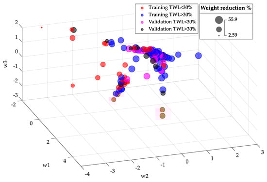 Figure 5 shows the position within the low-dimensional space of the variables (w1, w2, w3) of the patients in the training group together with the estimated position of the patients in the validation group. Patients from the validation group with insufficient weight reduction after surgery (TWL < 30%) are represented in magenta, while those with adequate weight reduction (TWL ≥ 30%) are represented in black.