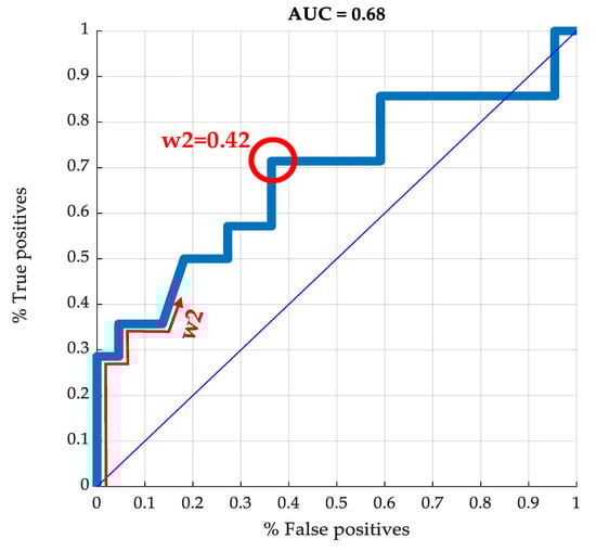 Since the best possible threshold value for w2u was not known, we tested all possible threshold values for w2u for the proposed classification system in the range of values of w2, which takes values between −3.6638 and 2.3480. The receiver operating characteristic (ROC) curve was obtained for this classifier.