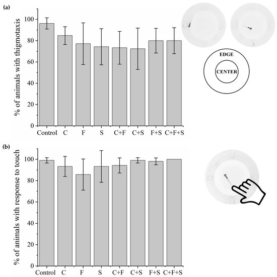 Larvae that were exposed to single pesticides and their mixtures. Thigmotaxis (Figure 2a) and touch sensitivity (Figure 2b) tests showed no significant difference from the control group.