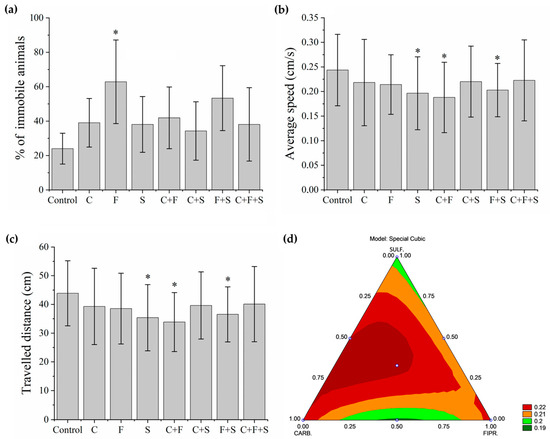 Mean total percentage and SD of larvae that remained immobile during the Exploratory Activity test (a). Groups were compared to the control group using a one-way ANOVA (F (7,55) = 2. 71277, p < 0.01) followed by Tukey’s test (C p = 0.84; F p = 0.01; S p = 0.88; C + F p = 0.70; C + S p = 0.98; F + S p = 0.13; C + F + S p = 0.88), p < 0.05 (*). Mean Speed of larvae swimming during the test (b). Groups were compared to the control group using a one-way ANOVA (F (7,435) = 4.0053, p < 0.01) followed by Tukey’s test (C p = 0.44; F p = 0.37; S p = 0.002; C + F p < 0.05; C + S p = 0.52; F + S p = 0.03; C + F + S p = 0.67), p < 0.05 (*). Mean Total Distance traveled by larvae that swam during the test (c). Groups were compared to the control group using a one-way ANOVA (F (7,435) = 4. 00565, p < 0.01) followed by Tukey’s test (C p = 0.44; F p = 0.37; S p = 0.003; C + F p < 0.05; C + S p = 0.52; F + S p = 0.03; C + F + S p = 0.68), p < 0.05 (*). (d) Ternary contour plot of the variables Carbendazim, Fipronil, and Sulfentrazone for a special cubic model (F (3,380) = 3.004, p = 0.03), evaluating the individual effects and interactions of these pesticides in their mixtures. Carbendazim and Sulfentrazone were more toxic by reducing the total distance traveled (green areas). Key: Contr—Control; C—Carbendazim; F—Fipronil; S—Sulfentrazone.