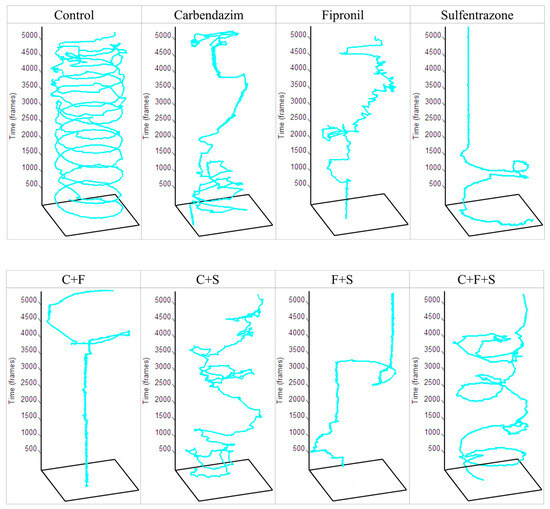 Total trajectory traveled by a zebrafish larva from each experimental and control group in one well of a 48-well plate during the 3 min recording of the Exploratory Activity test. Key: Contr—Control; C—Carbendazim; F—Fipronil; S—Sulfentrazone.