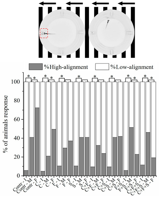 Mean total percentage of zebrafish larvae alignment to the well during the Optomotor Response test. If the larva is inside the red demarcated area, it is considered high alignment, and outside the area is low alignment. It was analyzed by Bowker’s symmetry test, p < 0.05 (*), to the same group among initial, middle, and final test positions. (Contr p < 0.05; C p < 0.05; F p = 0.16; S p = 1; C + F p = 0.16; C + S p = 0.88; F + S p < 0.05; C + F + S p < 0.05). Key: Contr—Control; C—Carbendazim; F—Fipronil; S—Sulfentrazone; I—Initial; M—Middle; F—Final.