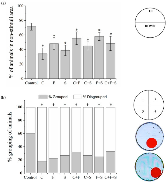 Mean total percentage and SD of larvae that exhibited escape behavior about the visual stimulus and stayed longer in the upper part of the well, area without stimulus, during the Bouncing Ball test (a). The response of each group was compared to the control group by one-way ANOVA (F (7,55) = 17.11, p < 0.01) followed by Tukey’s test (C p < 0.05; F p < 0.05; S p < 0.05; C + F p = 0; C + S p < 0.05; F + S p = 0.03; C + F + S p < 0.05), p < 0.05 (*). Percent grouping of larvae during the Bouncing Ball test (b), groups were compared to the control group using a one-way ANOVA (F (7,55) = 6.20, p < 0.01) followed by Tukey’s test (C p < 0.05; F p < 0.05; S p < 0.05; C + F p < 0.05; C + S p < 0.05; F + S p < 0.05; C + F + S p = 0.01), p < 0.05 (*). Key: C—Carbendazim; F—Fipronil; S—Sulfentrazone.