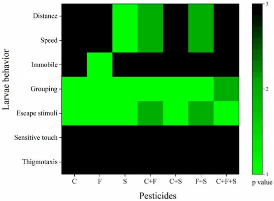 Cluster analysis of behaviors of larvae exposed to single and mixed pesticides at 6 dpf. p value compared to the control group as a variable. The green bars indicate values of 1–2, and the black bars indicate a value of 3. Key: C—Carbendazim; F—Fipronil; S—Sulfentrazone.