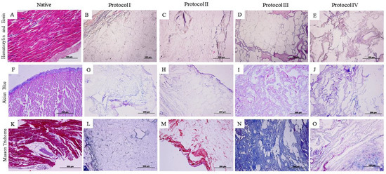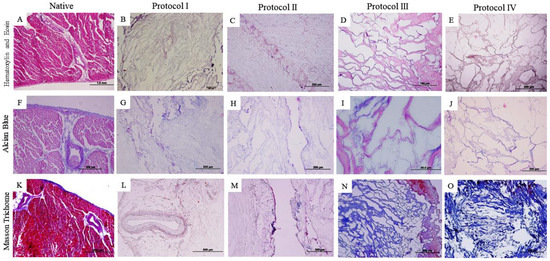 Histological images of the canine myocardium (right ventricle) stained in Hematoxylin and Eosin (A–E), Alcian Blue (F–J), and Masson’s Trichrome (K–O). (A,F,K): native myocardium; (B,G,L): decellularized myocardium using 1% Sodium Dodecyl Sulfate (SDS) for 7 days; 1% Triton-X-100 for 48 h; (C,H,M): 1% Sodium Dodecyl Sulfate (SDS) for 5 days, 1% Triton X-100 for 48 h; (D,I,N): Trypsin 0.05% for 1 h at 36 °C, freeze −80 °C overnight, 1% Sodium Dodecyl Sulfate (SDS) for 3 days, Triton X-100 for 48 h; (E,J,O): Trypsin 0.05% for 1 h at 36 °C, freeze −80 °C overnight, 1% Sodium Dodecyl Sulfate (SDS) for 2 days, 1% Triton X-100 for 24 h.