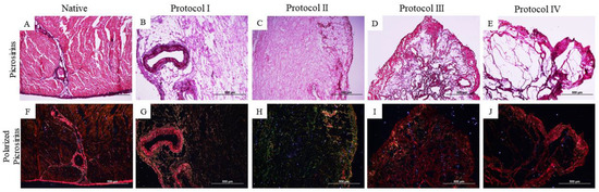 Histological images of the canine myocardium (right ventricle) stained with non-polarized Picrosirius-red (A–E) and polarized Picrosirius-red (F–J). (A,F): Native myocardium; (B,G): Decellularized myocardium using 1% Sodium Dodecyl Sulfate (SDS) for 7 days, 1% Triton-X-100 for 48 h; (C,H): 1% Sodium Dodecyl Sulfate (SDS) for 5 days, 1% Triton X-100 for 48 h; (D,I): Trypsin 0.05% for 1 h at 36 °C, freeze −80 °C overnight, 1% Sodium Dodecyl Sulfate (SDS) for 3 days, Triton X-100 for 48 h; (E,J): Trypsin 0.05% for 1 h at 36 °C, freeze −80 °C overnight, 1% Sodium Dodecyl Sulfate (SDS) for 2 days, 1% Triton X-100 for 24 h.