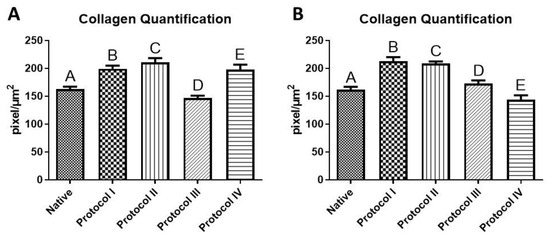 Collagen quantification. Quantification of collagen by the color deconvolution method using the Color_Decovolution2 plugin installed in the ImageJ 1.53e software (https://imagej.nih.gov/ij/index.html; accessed on 2 January 2024). (A) Right ventricle; (B) Left Ventricle. Protocol I: 1% Sodium Dodecyl Sulfate (SDS) for 7 days, 1% Triton-X-100 for 48 h; Protocol II: 1% Sodium Dodecyl Sulfate (SDS) for 5 days, 1% Triton X-100 for 48 h; Protocol II: 1% Sodium Dodecyl Sulfate (SDS) for 5 days, 1% Triton X-100 for 48 h; Protocol III: Trypsin 0.05% for 1 h at 36 °C, freeze −80 °C overnight, 1% Sodium Dodecyl Sulfate (SDS) for 3 days, and Triton X-100 for 48 h; Protocol IV: Trypsin 0.05% for 1 h at 36 °C, freeze −80 °C overnight, 1% Sodium Dodecyl Sulfate (SDS) for 2 days, 1% Triton X-100 for 24 h. Different uppercase letters indicate a significant difference (A ≠ B ≠ C ≠ D ≠ E). Mean ± SD, ANOVA and Tukey’s post-test, p < 0.05.