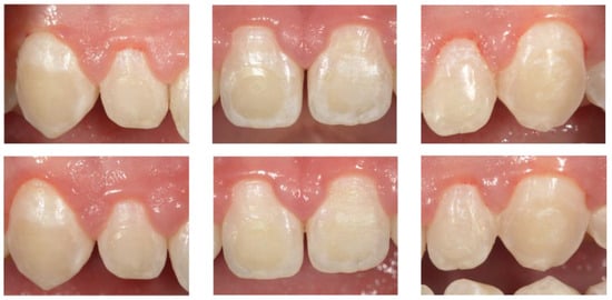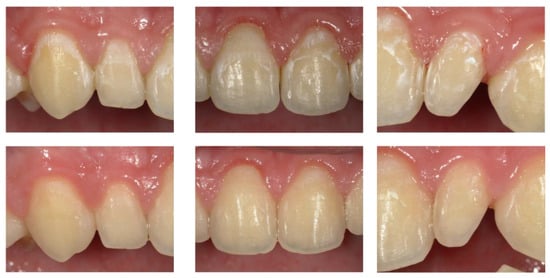 Currently, there is no treatment of choice for WSLs. In recent years, several methods have been proposed to prevent the onset of WSLs, such as the professional application of topical fluoride varnish [] and the application of mousse and varnish containing CPP-ACP (casein phosphopeptide-stabilized amorphous calcium phosphate complexes) [,,] and nHAp (nano-hydroxyapatite) []. Moreover, microabrasion and resin infiltration have been analyzed for the non-invasive treatment of WSLs [].