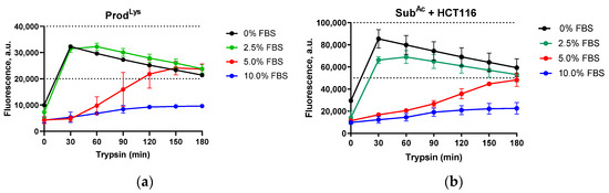 Effect of FBS (0, 2.5, 5, and 10%) on the generation of AMC fluorescent signal in a mixture of trypsin and ProdLys. (a) Increase in fluorescence upon digestion of ProdLys (10 μM) with trypsin (1 mg/mL) in cell medium (0–10% FBS); (b) increase in fluorescence upon treatment of culture media with trypsin (1 mg/mL) after a 24 h incubation of HCT116 cells in the presence of SubAc (30 μM).