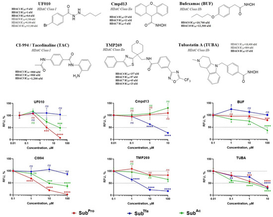 To our knowledge, the substrate selectivity of SubPro for HDACs class I in cellular systems has not been previously studied. Using HCT116 colon cancer cells that exhibited high HDAC activity under test conditions, we showed that SubPro deacylation was almost completely inhibited in the presence of UF010 [34] and CI-994/Tacedinaline (TAC) [35], two selective inhibitors of HDAC1/2/3 (Figure 2). Selective inhibitors of HDAC class IIa, namely Cmpd13 [36], and TMP269 [25], as well as a selective inhibitor of HDAC6/10 class IIb, i.e., Bufexamac (BUF) [37], did not affect the deacylation of SubPro.