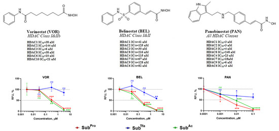 As part of further validation of the method, non-selective and pan-selective HDACi were tested—Vorinostat (VOR), Belinostat (BEL), and Panobinostat (PAN) (Figure 3). We observed a good agreement between the results of in-cell testing and the data obtained on recombinant enzymes [39], which was most clearly demonstrated in the case of VOR. This inhibitor that was inactive against HDAC class IIA in vitro also did not suppress SubTfa deacylation in cell (Figure 3). Since VOR, like TUBA, is a strong inhibitor of HDAC6/10, it became clear that the deviations in the performance of the test system observed in the case of TUBA are related to its structural features and not to HDAC selectivity.
