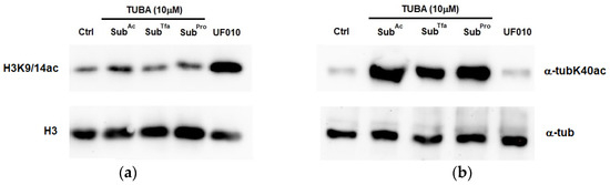 Western blot analysis of the inhibitory effect of TUBA on HDACs in the presence of SubAc/Pro/Tfa. (a) Accumulation of histone H3K9/14ac, the substrate of HDACs class I. (b) Accumulation of α-tubulineK40ac, substrate of HDAC6 class IIb; HCT116 cells were incubated for 24 h in the presence of TUBA (10 µM) and SubAcyl substrate (30 µM). HDAC class I inhibitor UF010 (10 µM) was taken as a positive (a) or negative (b) control.