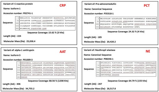 Firstly, all biomarkers (CRP, NE, PCT and AAT presence) were positively verified using the Human Salivary Proteome Wiki [], where salivary proteins were identified by high-throughput proteomic technologies (Figure 1).