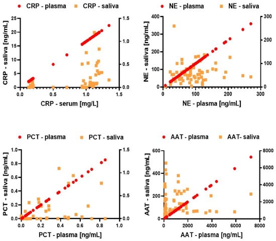 Commercial ELISA kits were used to quantify both serum and saliva samples, ensuring accurate quantification of concentrations. This allowed investigation of the extent of the correlation of salivary and serum concentrations for 70 samples and the correlation of 4 biomarkers in both types of biological fluids. The average Pearson correlation coefficient (r) for paired biomarkers, such as CRP in serum versus CRP in saliva, demonstrated a positive and statistically significant association for CRP (r = 0.5) and PCT (r = 0.46) (**** p < 0.0001). In contrast, NE showed a generally positive correlation (r = 0.08, p = 0.46), while AAT displayed a predominantly negative correlation (r = −0.02, p = 0.85).