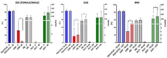 Furthermore, NE exhibited significantly higher levels in the >40-year-old group compared to the younger 18–40 (* p = 0.01), whereas AAT was enhanced in individuals with BMI ≥ 25 age group (* p = 0.01). However, the remaining differences in biomarker levels within the analyzed group did not reveal significant distinctions.