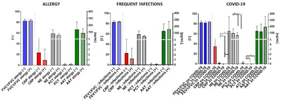 Comparison of FEV1/FVC, and salivary CRP, NE, PCT, and AAT levels within distinct clinical subgroups: with allergy (“−”) vs. without allergy (“+”), individuals with frequent (“infections +”) vs. non-frequent respiratory tract infections (“infections –”), and the frequency presence of COVID-19 (no COVID-19, 1–2x COVID-19 occurrence) among healthy non-smoking individuals. Data are expressed as mean (±S.D.); * = p < 0.05, ** = p < 0.01.