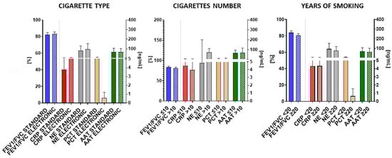 Surprisingly, the group of smokers did not exhibit any notable distinctions in spirometric and molecular parameters concerning the type of cigarettes (standard and electronic), the quantity of cigarettes consumed, or the duration of smoking habits (Figure 5).